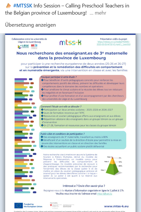 The MTSS-K research project sets out to adapt, implement and assess the effectiveness and efficiency of a Multi-Tiered System of Support in kindergarten (MTSS-K) across five European countries with the aim to reduced inequalities within the education system and strengthen pupils’ early skills in literacy, numeracy and socio- emotional behaviour.